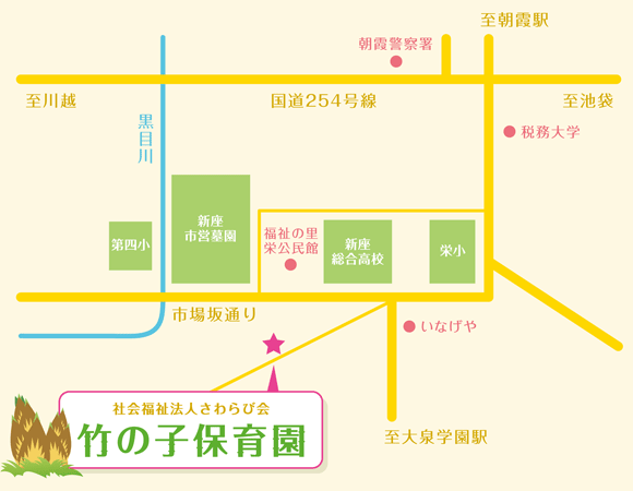 アクセス 名称 社会福祉法人さわらび会 竹の子保育園 住所 〒352-0014 埼玉県新座市栄3丁目4-5 アクセス 東武東上線朝霞駅から:西武バス/大泉学園駅北口行き乗車、新座総合技術高校前下車3分。西武池袋線大泉学園駅北口から:西武バス/朝霞駅行き乗車、都民農園セコニック前下車3分 電話番号 048-423-4653 近郊地図 Google Mapsで現地を表示する